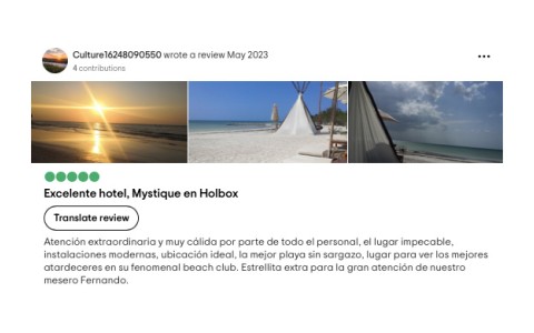 Mystique Holbox se enorgullece de haber recibido el prestigioso premio Travellers' Choice de Tripadvisor. Este reconocimiento se otorga a los hoteles que consistentemente reciben excelentes opiniones de los viajeros y se encuentran entre el 10% de las mejores propiedades en Tripadvisor.